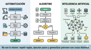 La automatización es otra cosa. Se refiere a ejecutar tareas de manera automática sin intervención constante de una persona. Puede usar reglas fijas, scripts, flujos condicionales o integraciones entre sistemas. Muchas automatizaciones no tienen aprendizaje, ni inferencia, ni flexibilidad real: simplemente hacen lo que se les dijo que hicieran.