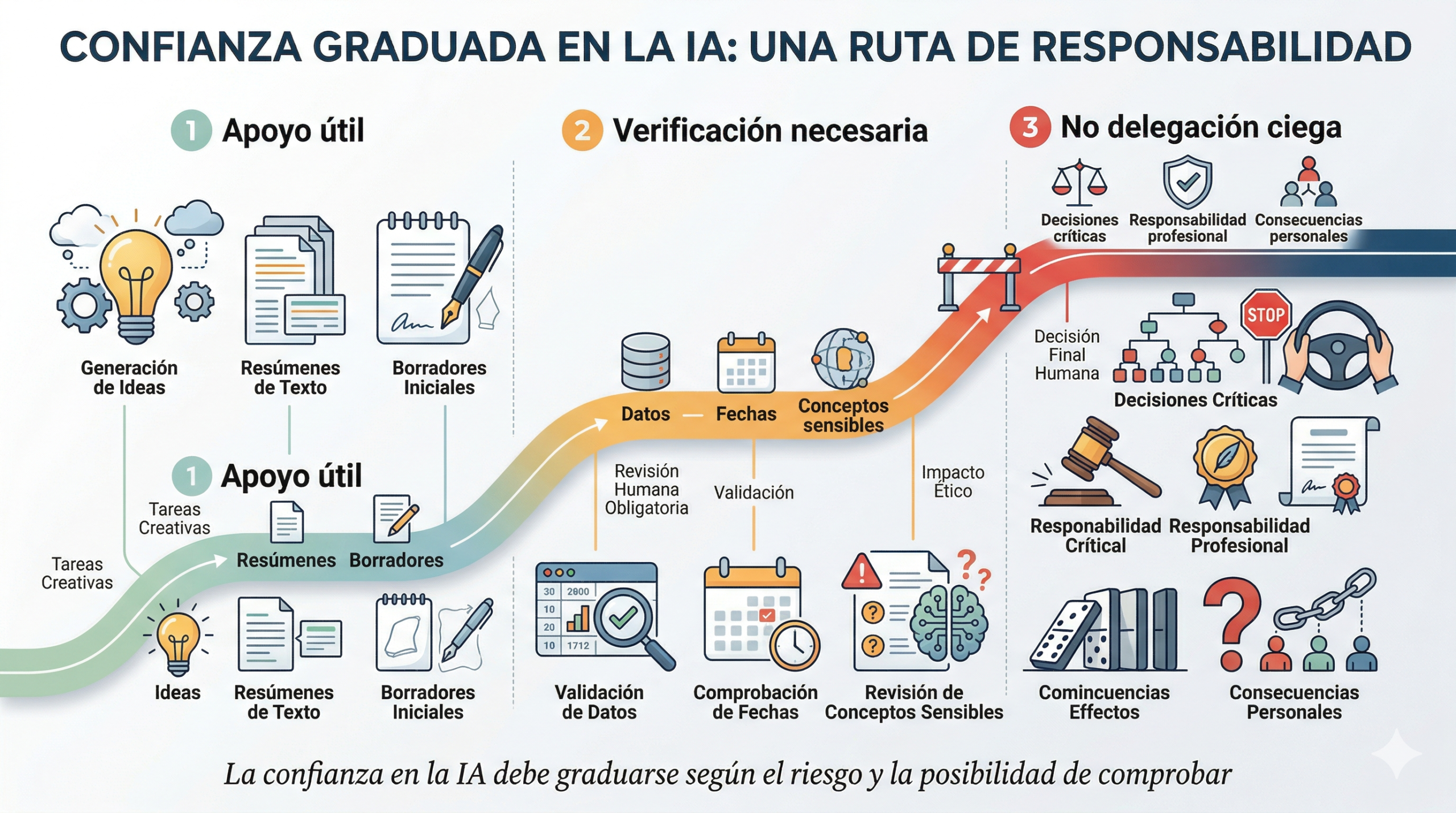 Este principio será cada vez más importante en la vida profesional. El problema ya no será solo “saber usar una herramienta”, sino saber cuándo esa herramienta merece confianza operativa, cuándo solo merece valor como apoyo provisional y cuándo exige supervisión humana directa.